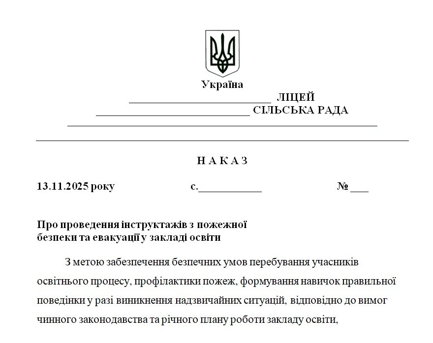 Матеріали «Наказ “Про проведення інструктажів з пожежної безпеки та евакуації у закладі освіти”» будуть надіслані в електронному вигляді на вашу поштову скриньку одразу після оплати.
