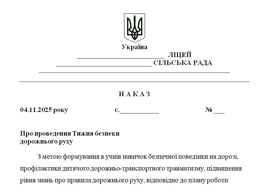 Матеріали «Наказ “Про проведення Тижня безпеки дорожнього руху у 2025/2026 н.р.”» будуть надіслані в електронному вигляді на вашу поштову скриньку одразу після оплати.