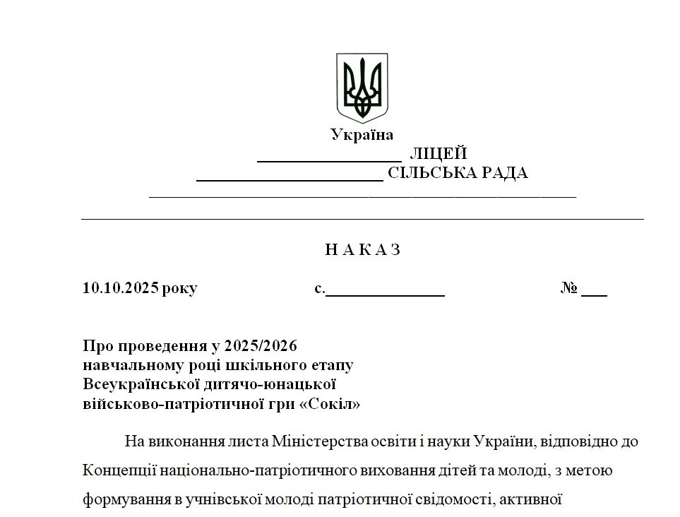 Щоб купити «Наказ “Про проведення у 2025/2026 навчальному році шкільного етапу Всеукраїнської дитячо-юнацької військово-патріотичної гри «Сокіл»”», потрібно додати матеріал до кошика та оплатити замовлення.