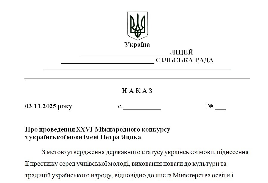 Матеріали «Наказ “Про проведення XXVI Міжнародного конкурсу з української мови імені Петра Яцика у 2025/2026 н.р.”» будуть надіслані в електронному вигляді на вашу поштову скриньку одразу після оплати.