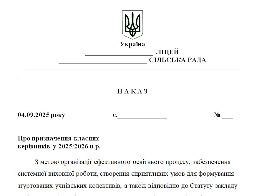З метою організації ефективного освітнього процесу, забезпечення системної виховної роботи, створення сприятливих умов для формування згуртованих учнівських колективів, а також відповідно до Статуту закладу освіти та на підставі кадрового складу педагогічних працівників,
