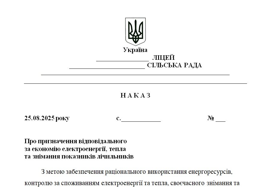 Матеріали «Наказ “Про призначення відповідального за економію електроенергії, тепла та знімання показників лічильників”» будуть надіслані в електронному вигляді на вашу поштову скриньку одразу після оплати.
