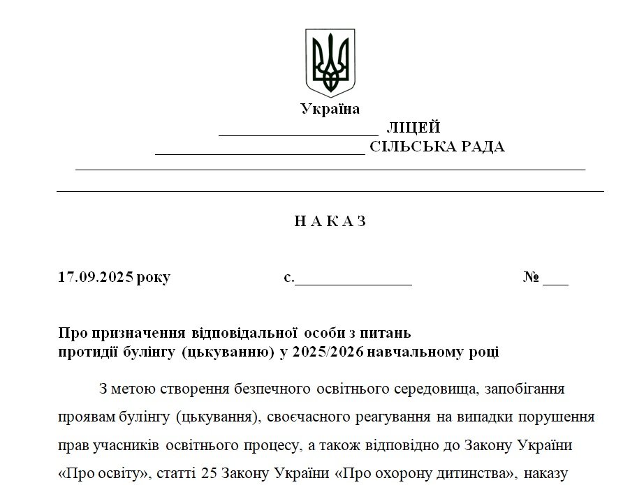 Матеріали «Наказ “Про призначення відповідальної особи з питань протидії булінгу (цькуванню) у 2025/2026 навчальному році”» будуть надіслані в електронному вигляді на вашу поштову скриньку одразу після оплати.