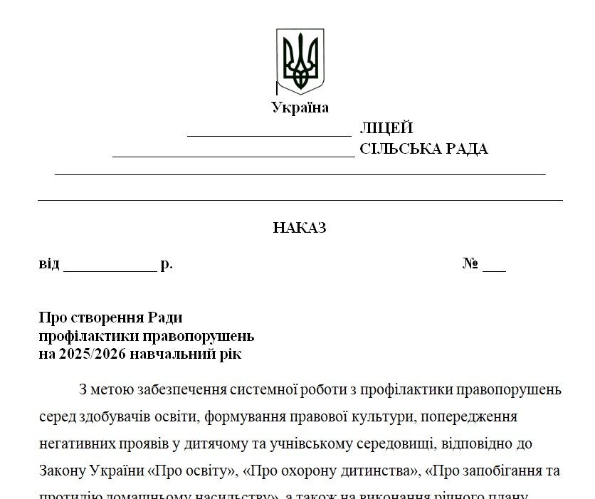 РАДА З ПРОФІЛАКТИКИ ПРАВОПОРУШЕНЬ У ЗАКЛАДІ ОСВІТИ. 2024-2025 НАВЧАЛЬНИЙ РІК. ПЛАН РОБОТИ. ПРОТОК...