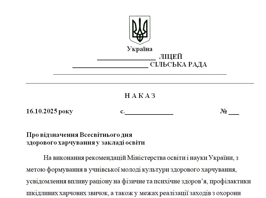 Наказ “Про відзначення Всесвітнього дня здорового харчування у закладі освіти”