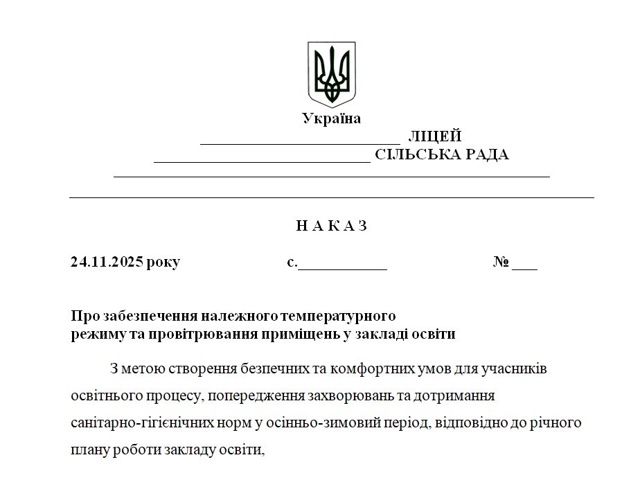Наказ “Про забезпечення належного температурного режиму та провітрювання приміщень у закладі освіти”