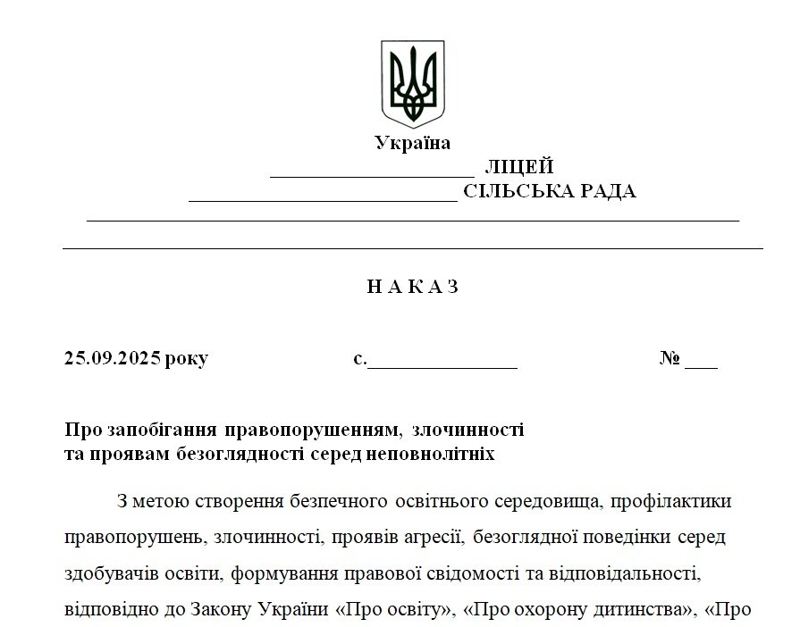 Наказ “Про організацію роботи з профілактики правопорушень та злочинності серед учнів закла...