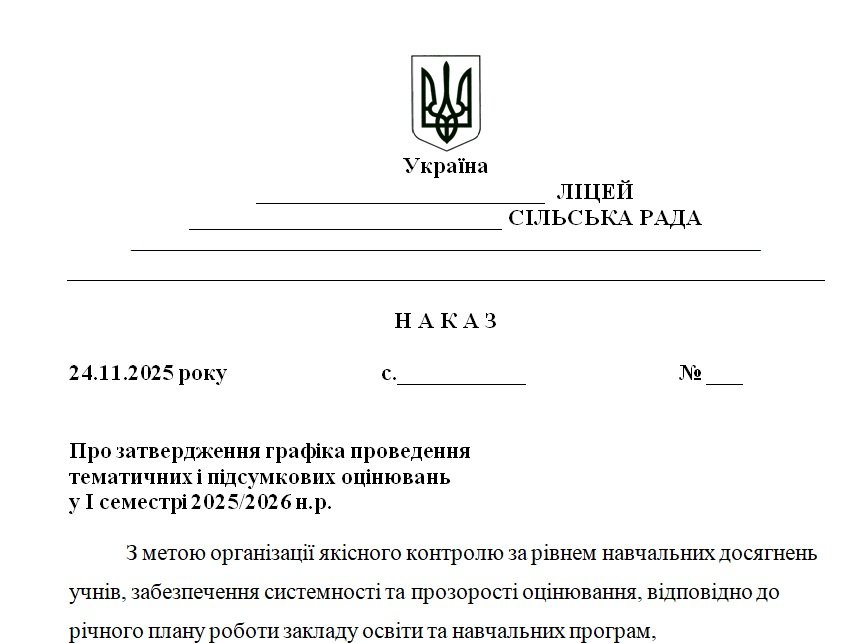 Матеріали «Наказ “Про затвердження графіка проведення тематичних і підсумкових оцінювань у І семестрі 2025/2026 н.р.”» будуть надіслані в електронному вигляді на вашу поштову скриньку одразу після оплати.