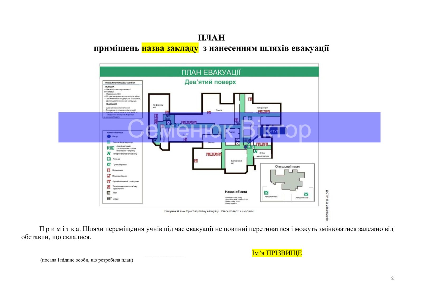 Відповідно до п. 1 розділу II Правил пожежної безпеки для навчальних закладів та установ системи освіти України, затверджених наказом Міністерства освіти і науки України 15 серпня 2016 року № 974, з зареєстровано в Міністерстві юстиції України 08 вересня 2016 р. за № 1229/29359, Правил пожежної безпеки в Україні, затверджених наказом Міністерства внутрішніх справ України 30 грудня 2014 року № 1417,зареєстровано в Міністерстві юстиції України 05 березня 2015 р. за № 252/26697, ДСТУ ISO 23601:2019 «Ідентифікація безпечності. Знаки на планах евакуації (ISO 23601:2009, IDT)», ДСТУ EN ISO 7010:2019 «Графічні символи. Кольори та знаки безпеки. Зареєстровані знаки безпеки», з метою забезпечення безпечних і нешкідливих умов навчання, праці, виховання та пожежної безпеки в закладі освіти