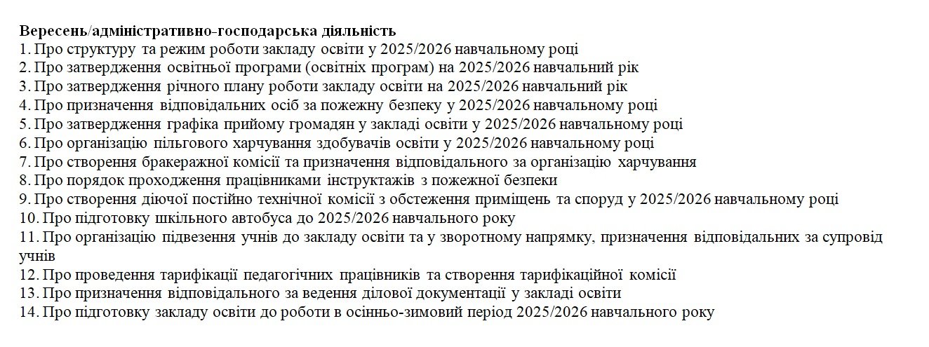 Накази адміністративно-господарської діяльності закладу освіти на вересень 2025/2026 н.р.