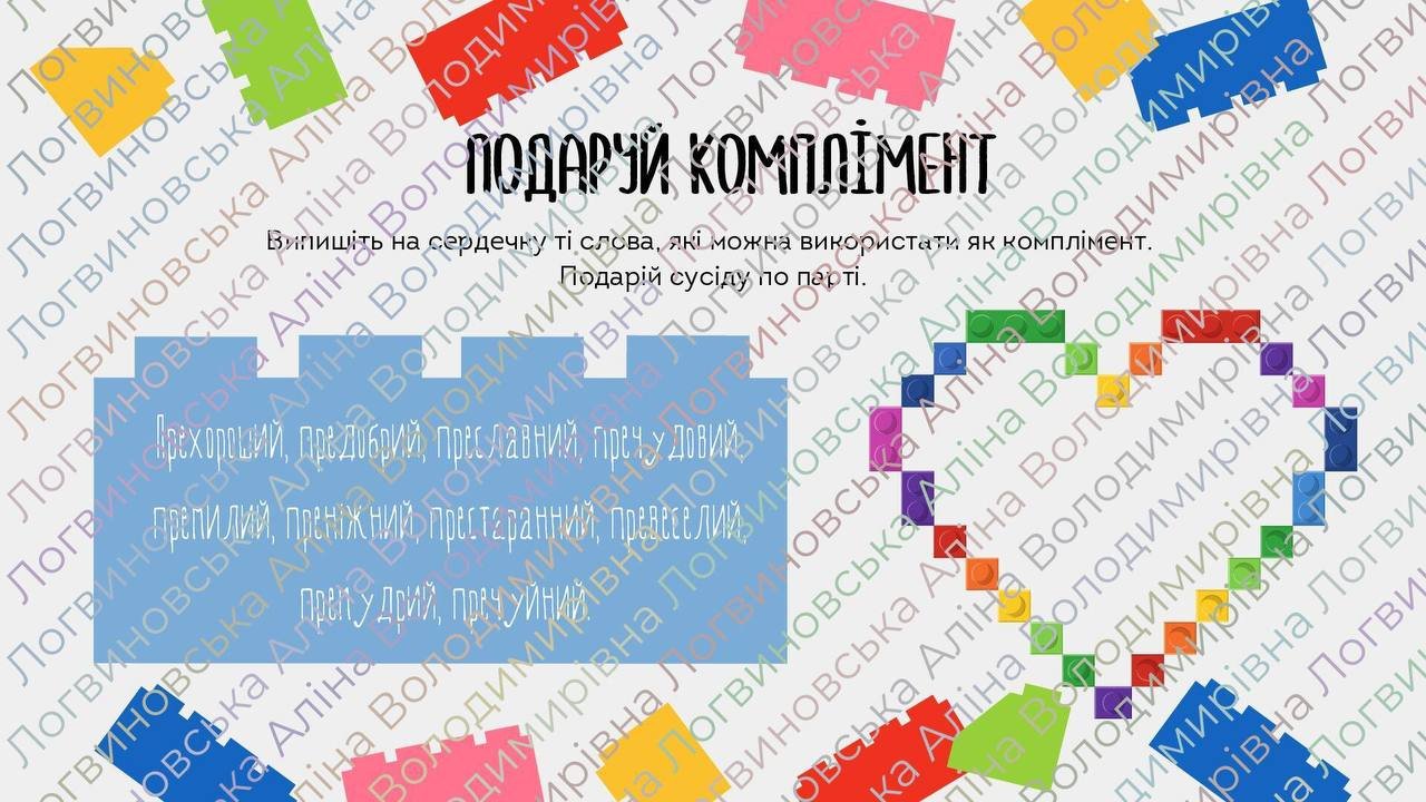 — вправи та ігрові завдання (“Гра ‘Хто швидше?’”, “Конструюймо!”, “Подаруй комплімент”);
