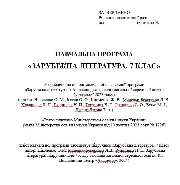 Навчальна програма з української літератури для 7 класу НУШ. Яценко Т.О. та ін. (70 год / 2 год н...
