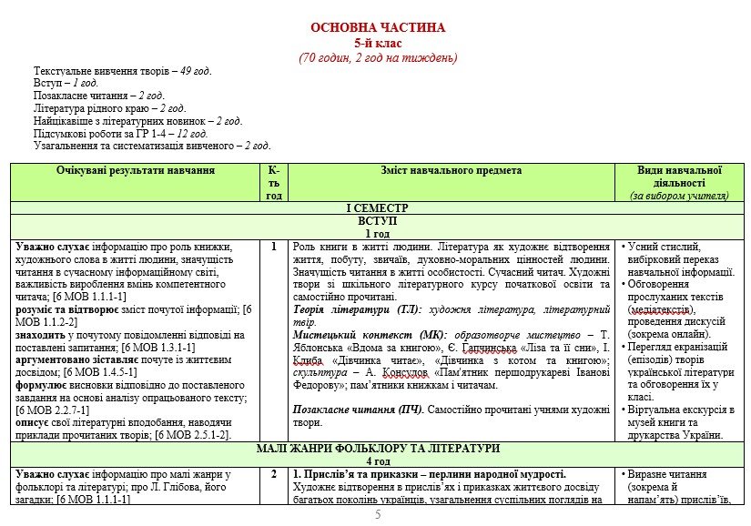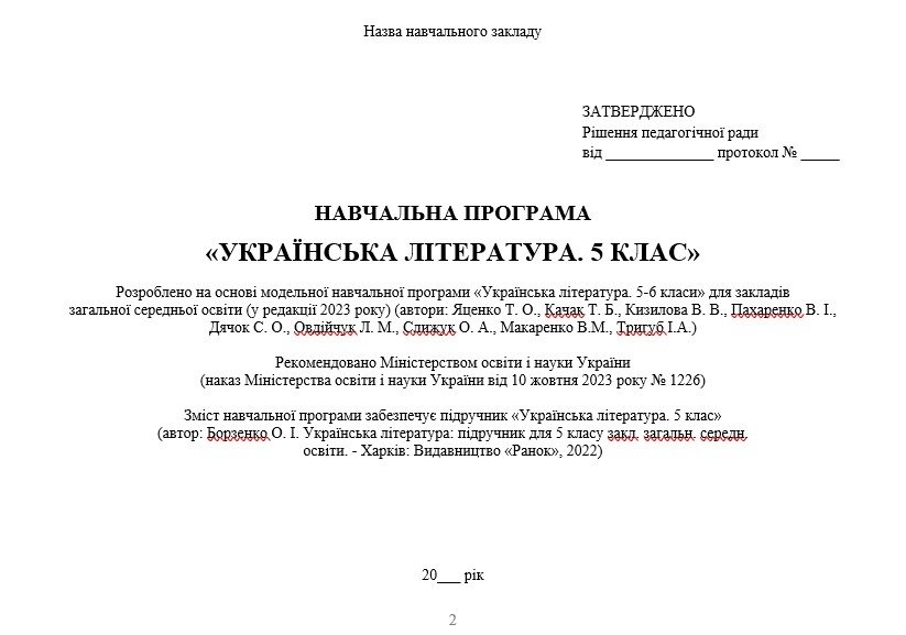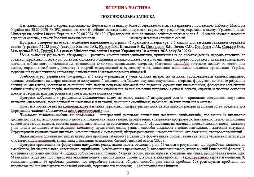 Навчальну програму укладено на основі модельної навчальної програми «Українська література. 5-6 класи» для закладів загальної середньої освіти (автори: Яценко Т.О., Качак Т.Б., Кизилова В.В., Пахаренко В.І., Дячок С.О., Овдійчук Л.М., Слижук О.А., Макаренко В.М., Тригуб І.А.), рекомендованої Міністерством освіти і науки України» (наказ Міністерства освіти і науки України від 10 жовтня 2023 року № 1226).