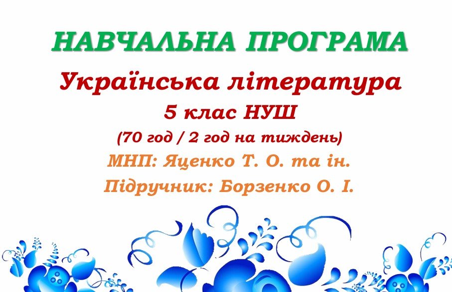 Зміст навчальної програми забезпечує підручник «Українська література. 5 клас»(автор: Борзенко О. І. Українська література: підручник для 5 класу закл. загальн. середн. освіти. – Харків: «Ранок», 2022).