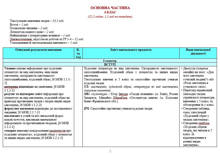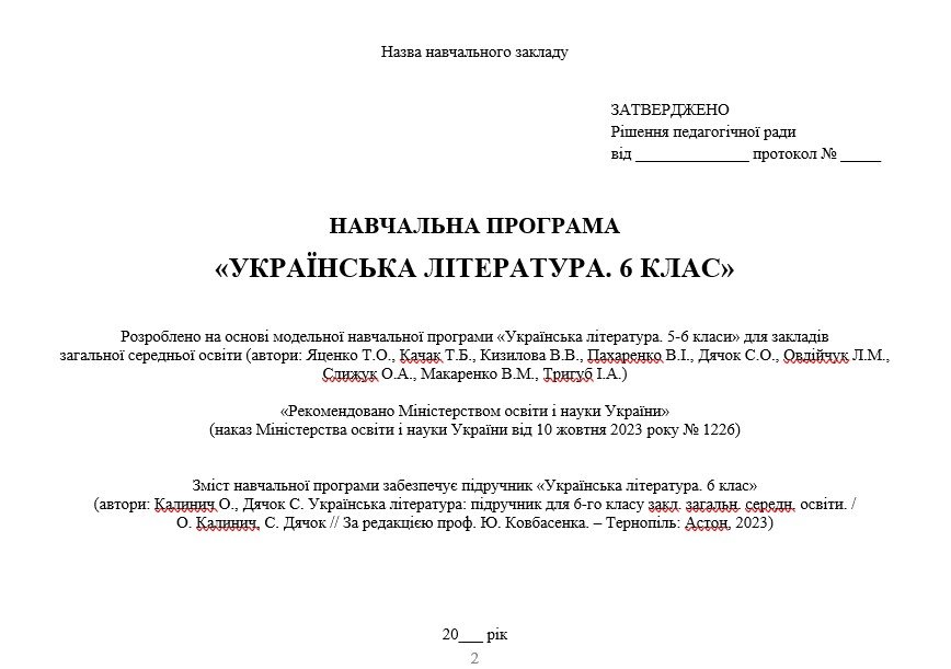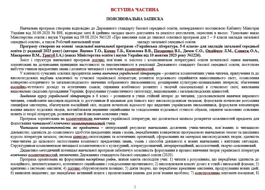 Навчальну програму укладено на основі модельної навчальної програми «Українська література. 5-6 класи» для закладів загальної середньої освіти (автори: Яценко Т. О., Качак Т. Б., Кизилова В. В., Пахаренко В. І., Дячок С. О., Овдійчук Л. М., Слижук О.А., Макаренко В.М., Тригуб І.А.), рекомендованої Міністерством освіти і науки України» (наказ Міністерства освіти і науки України від 10 жовтня 2023 року № 1226).