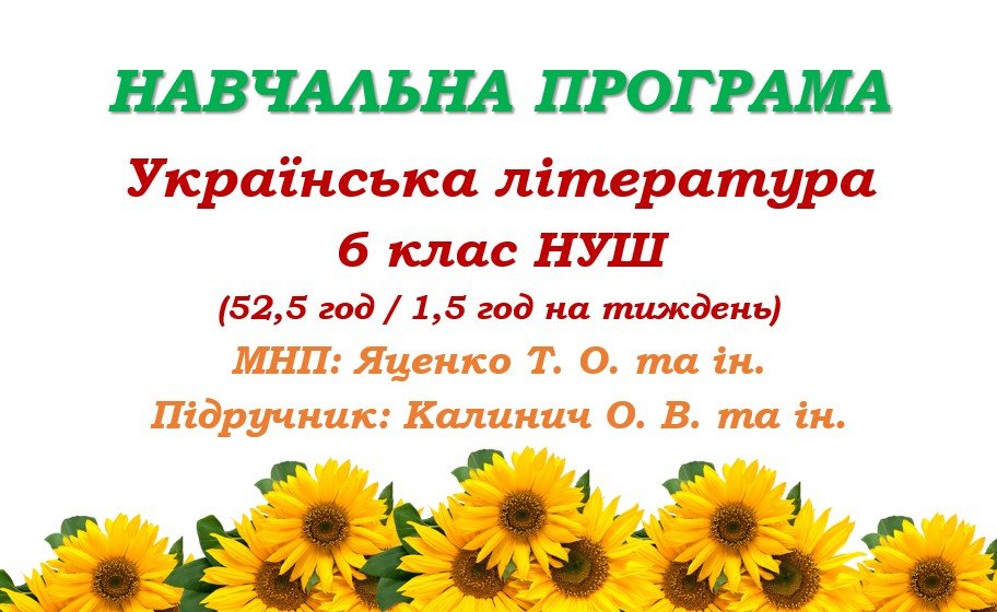 Головне зображення розробки: Навчальна програма. Українська література. 6 клас НУШ. Калинич О. В. та ін. (52,5 год / 1,5 год на тиждень)