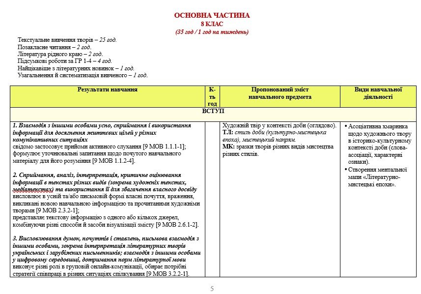 основна частина (результати навчання, пропонований зміст навчального предмета, види навчальної діяльності);