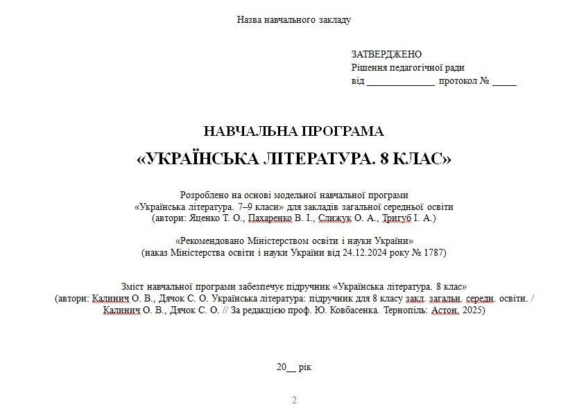 Зміст навчальної програми забезпечує підручник «Українська література. 8 клас»(автори: Калинич О. В., Дячок С. О. Українська література: підручник для 8 класу закл. загальн. середн. освіти. / Калинич О. В., Дячок С. О. // За редакцією проф. Ю. Ковбасенка. – Тернопіль: Астон, 2025).