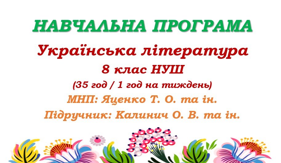 Матеріали «Навчальна програма. Українська література. 8 клас НУШ. Калинич О. В. та ін. (35 год / 1 год на тиждень)» будуть надіслані в електронному вигляді на вашу поштову скриньку одразу після оплати.