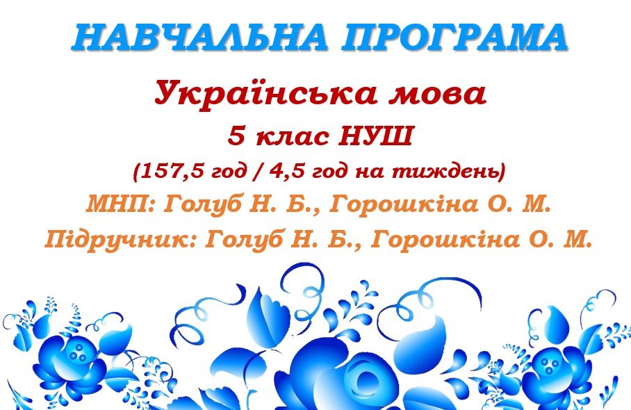 Зміст навчальної програми забезпечує підручник «Українська мова. 5 клас»(автори: Голуб Н. Б., Горошкіна О. М. Українська мова: підручник для 5 класу закл. загальн. середн. освіти. – К.: «Грамота», 2022).