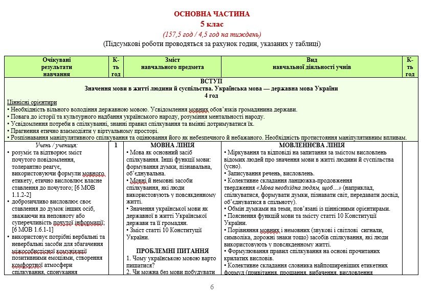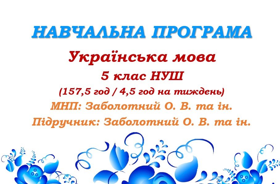Навчальна програма. Українська мова. 5 клас. Заболотний О. В. (157,5 год / 4,5 год на тиждень)