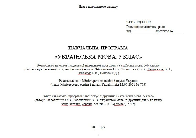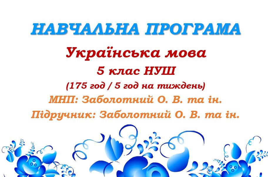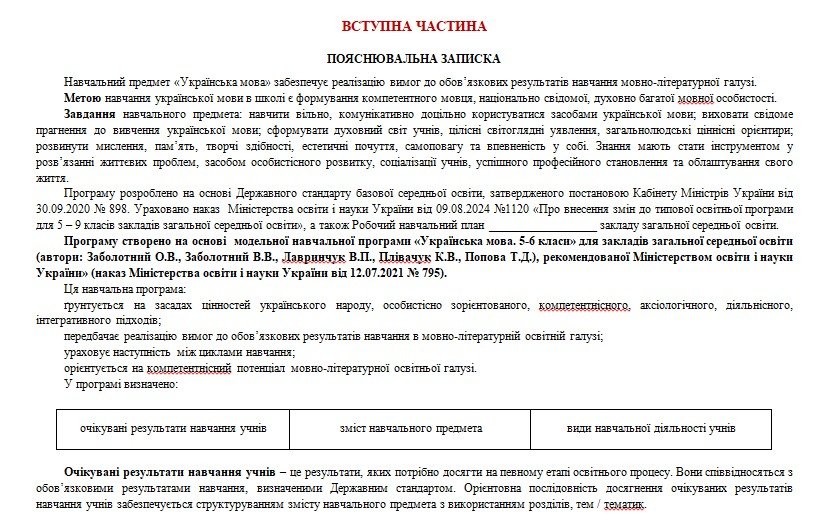 Навчальну програму укладено на основі модельної навчальної програми «Українська мова. 5-6 класи» для закладів загальної середньої освіти (автори: Заболотний О. В., Заболотний В. В., Лавринчук В. П., Плівачук К. В., Попова Т. Д.).