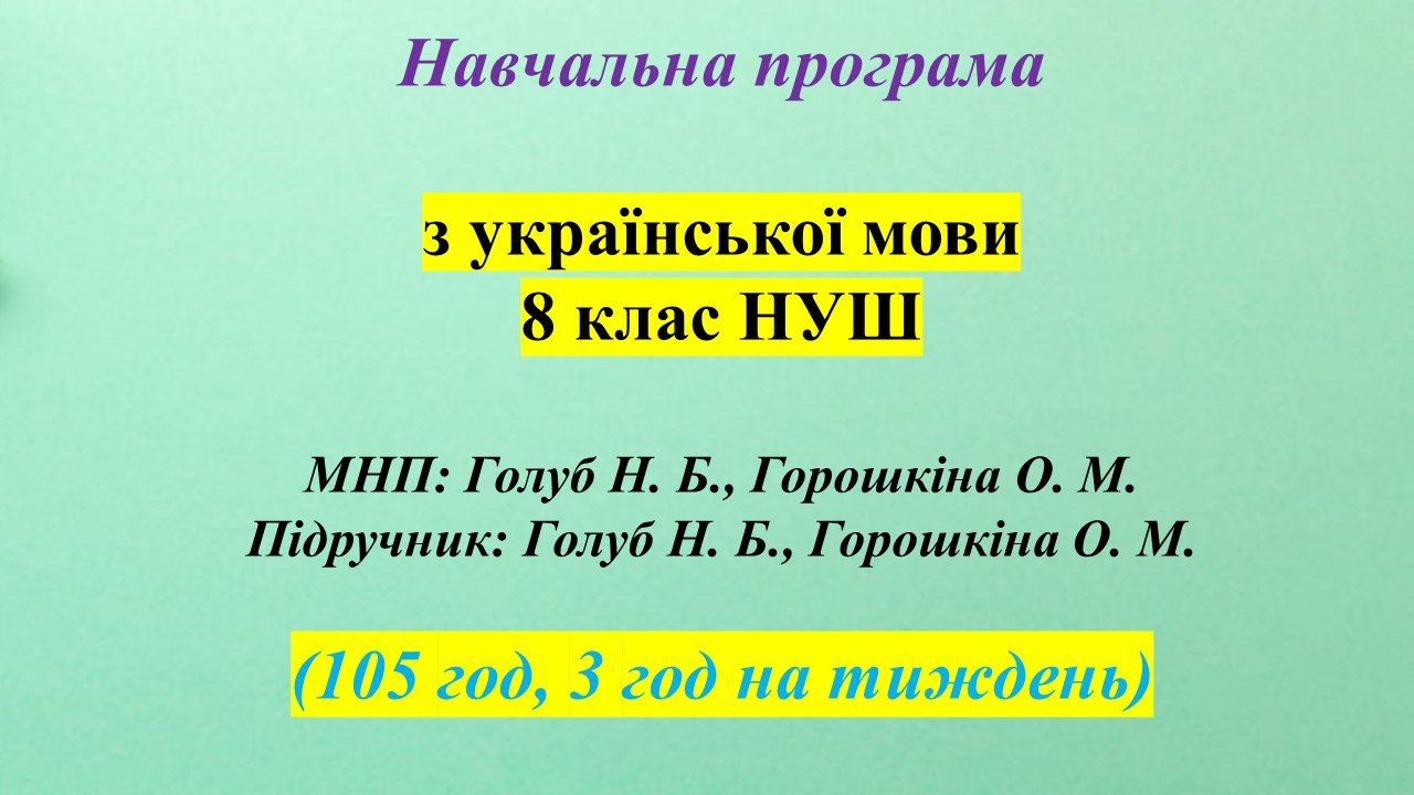 Навчальну програму укладено на основі модельної навчальної програми «Українська мова. 7-9 класи» для закладів загальної середньої освіти (автори: Голуб Н. Б., Горошкіна О. М.). Зміст навчальної програми забезпечує підручник «Українська мова. 8 клас»(автори: Голуб Н. Б., Горошкіна О. М. Українська мова: підручник для 8-го класу закл. загальн. середн. освіти. К.: «Грамота», 2025).