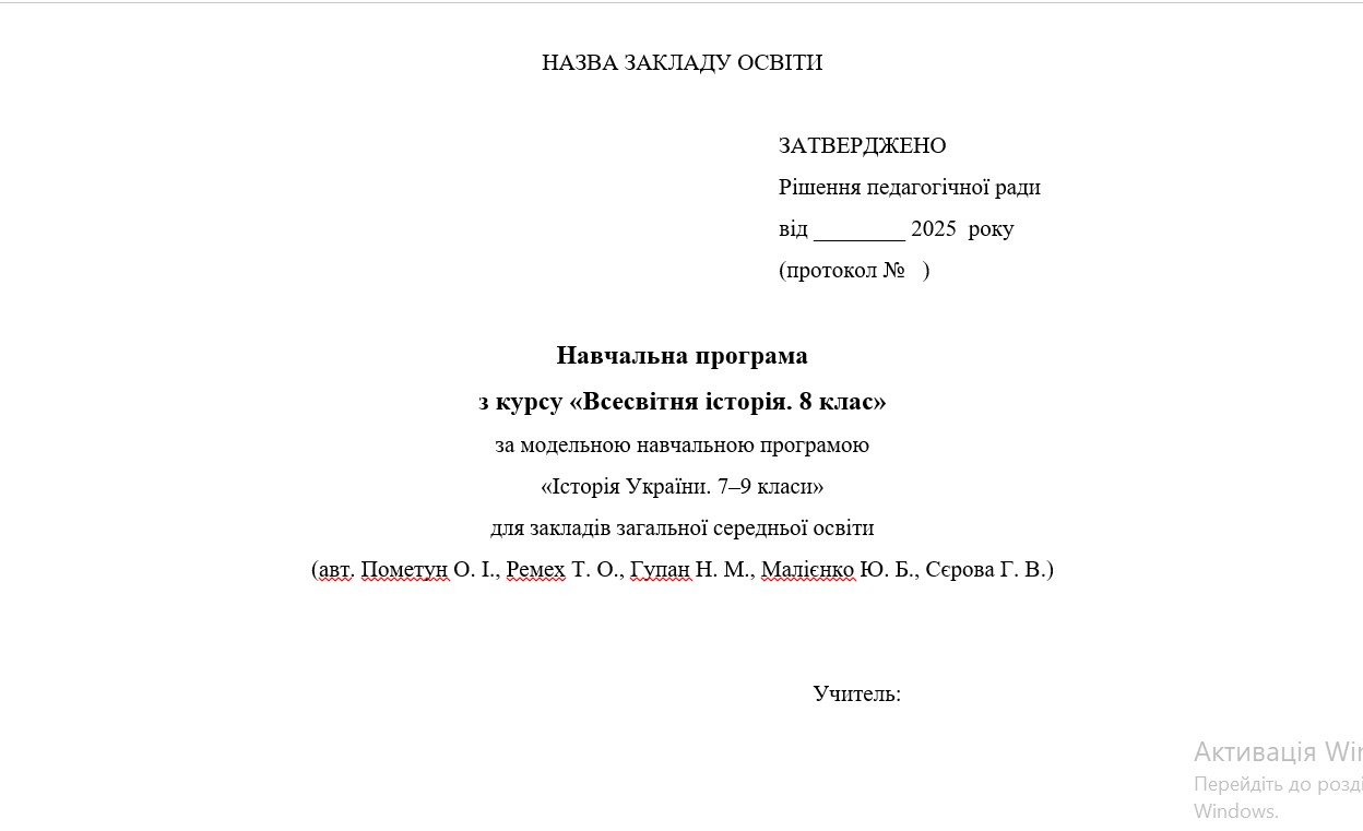 Навчальна програма з курсу «Всесвітня історія” на 2025-2026 навчальний рік. 8 клас. 35 годи...