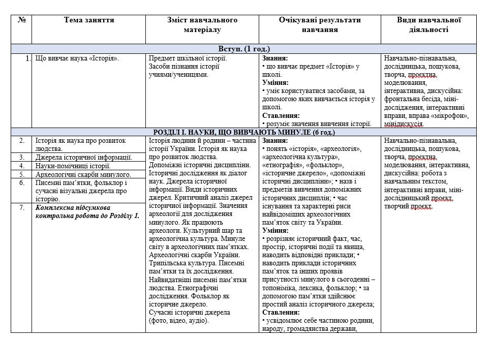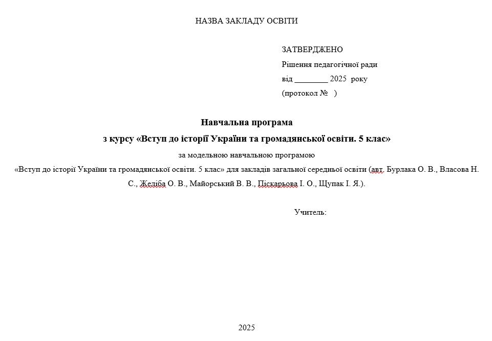 за модельною навчальною програмою «Вступ до історії України та громадянської освіти. 5 клас» для закладів загальної середньої освіти (авт. Бурлака О. В., Власова Н. С., Желіба О. В., Майорський В. В., Піскарьова І. О., Щупак І. Я.).