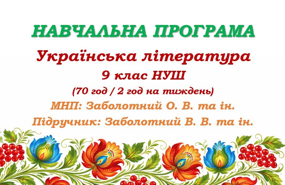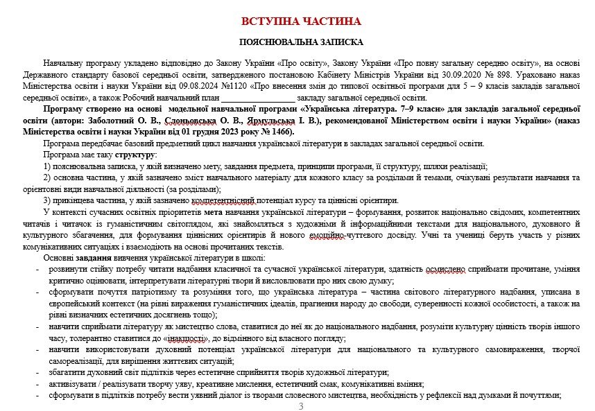 Навчальну програму укладено на основі модельної навчальної програми «Українська література. 7-9 класи» для закладів загальної середньої освіти (автори: Заболотний О. В., Слоньовська О. В., Ярмульська І. В.).
