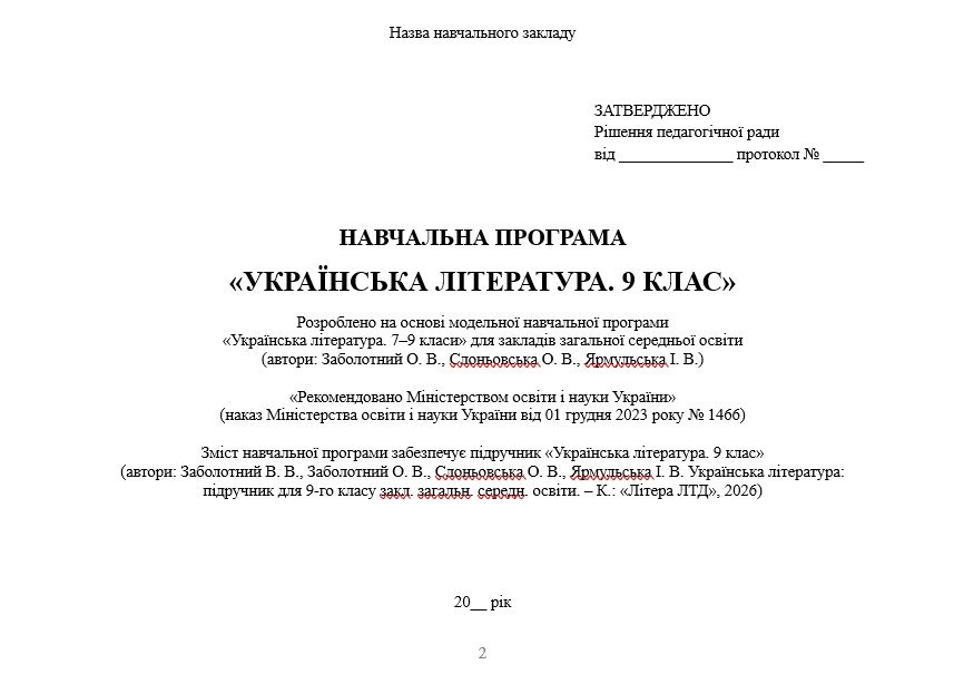 Зміст навчальної програми забезпечує підручник «Українська література. 9 клас»(автори: Заболотний В. В., Заболотний О. В., Слоньовська О. В., Ярмульська І. В. Українська література: підручник для 9-го класу закл. загальн. середн. освіти. К.: «Літера ЛТД», 2026).