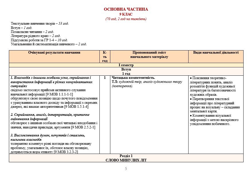 основна частина (результати навчання, пропонований зміст навчального предмета, види навчальної діяльності);