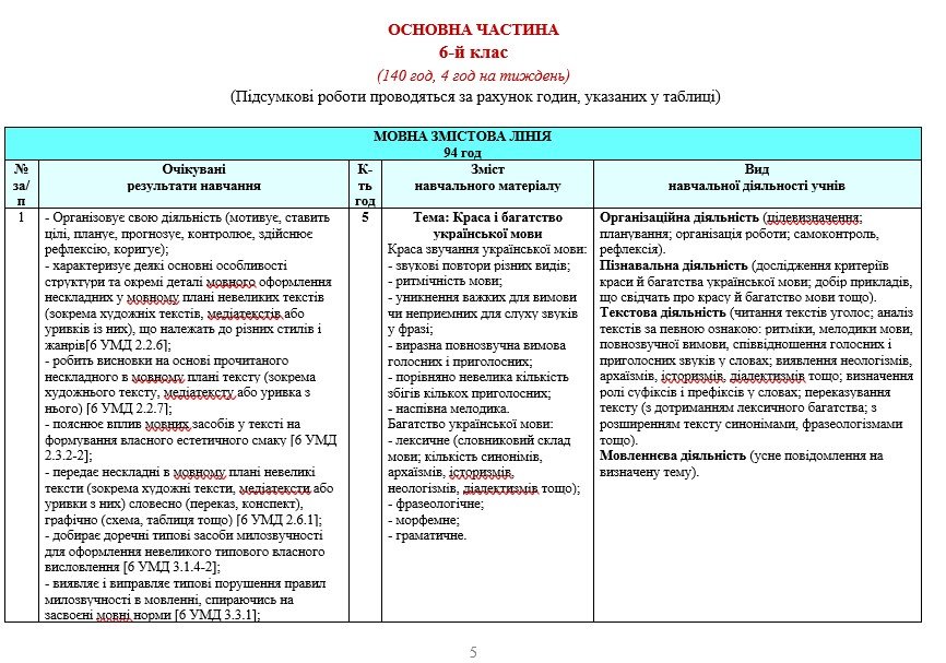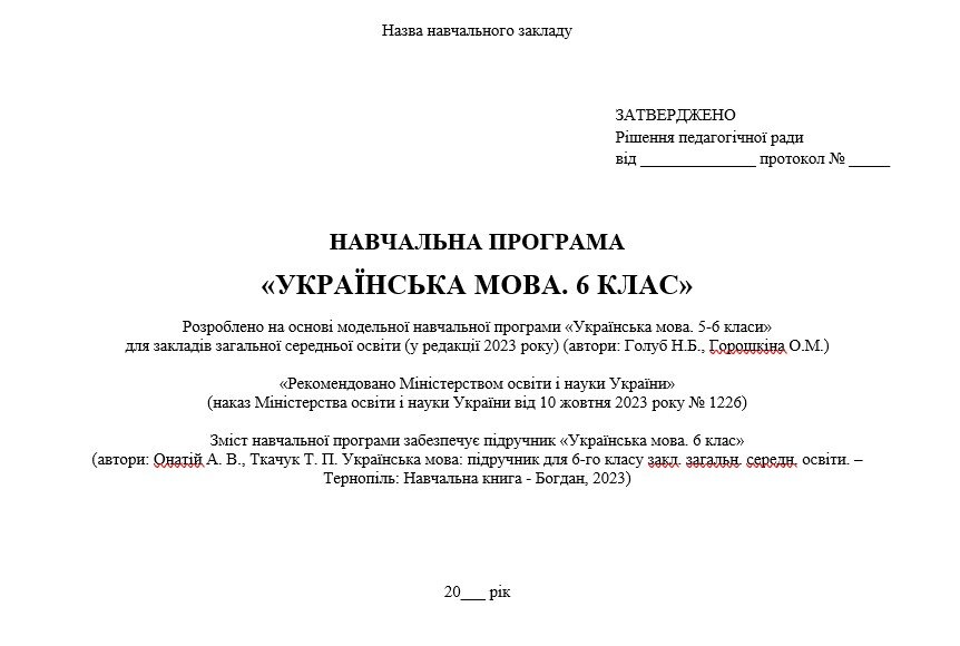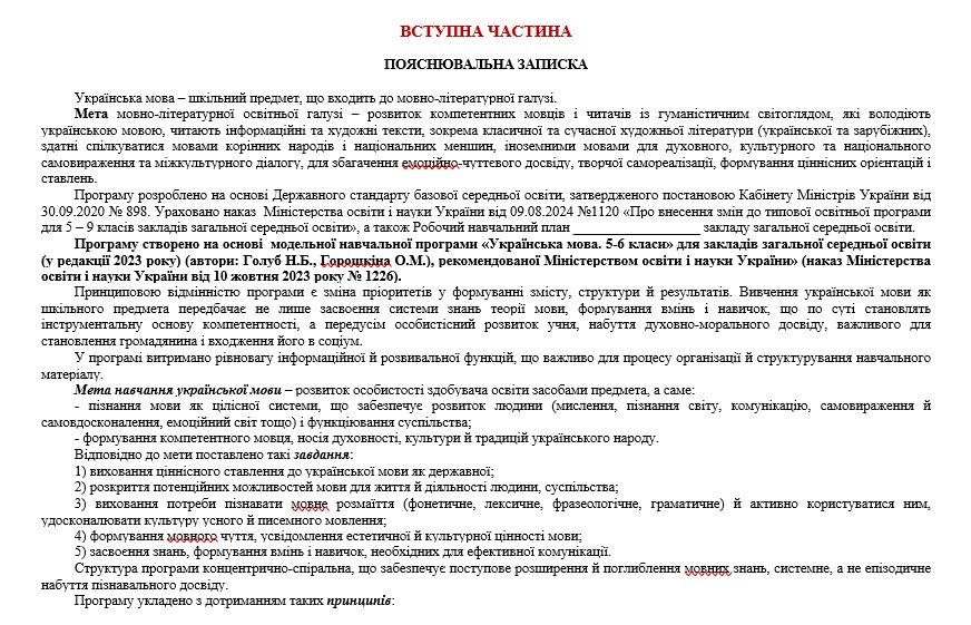 Навчальну програму укладено на основі модельної навчальної програми «Українська мова. 5-6 класи» для закладів загальної середньої освіти (автори: Голуб Н. Б., Горошкіна О. М.).