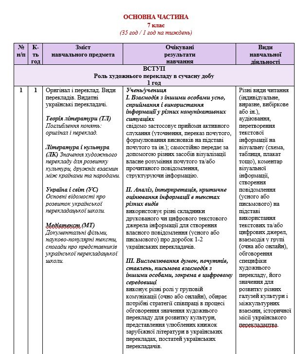• основна частина (результати навчання, пропонований зміст навчального предмета, види навчальної діяльності);