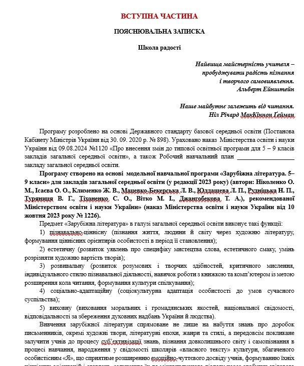 Навчальну програму укладено на основі модельної навчальної програми «Зарубіжна література. 5–9 класи» для закладів загальної середньої освіти у редакції 2023 року (автори: Ніколенко О. М., Ісаєва О. О., Клименко Ж. В., Мацевко-Бекерська Л. В., Юлдашева Л. П., Рудніцька Н. П., Туряниця В. Г., Тіхоненко С. О., Вітко М. І., Джангобекова Т. А.). Рекомендовано Міністерством освіти і науки України (наказ Міністерства освіти і науки України від 10 жовтня 2023 року № 1226).