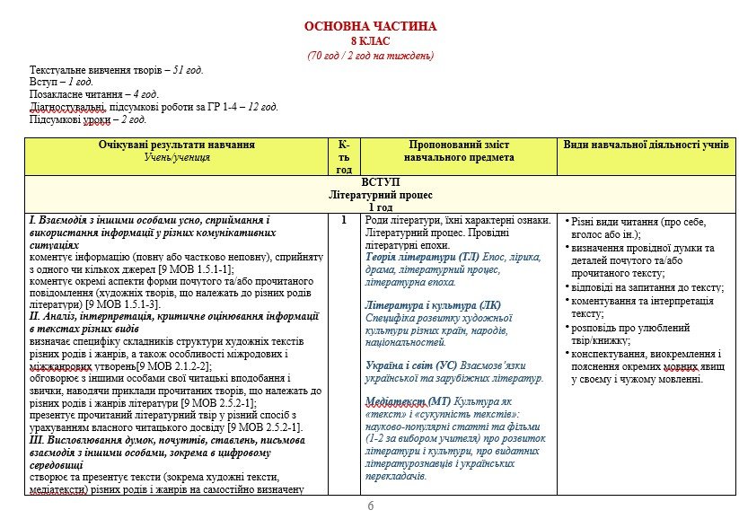 Календарне планування з ГР. Українська література. 8 клас НУШ. Авраменко О. М. (70 год / 2 год на...