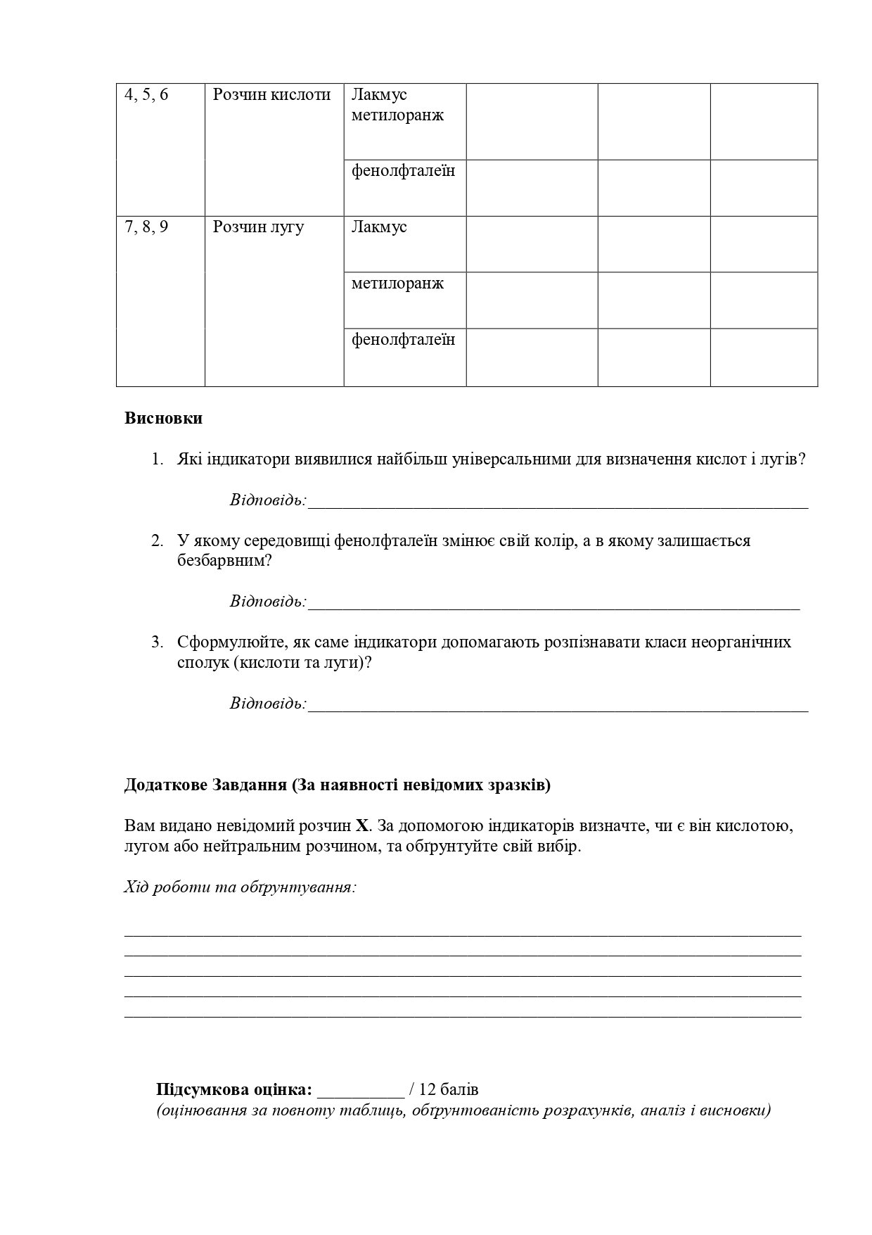 Пропоную інструктивну картку до навчального дослідження № 3 з хімії у 8 класі до теми: «Виявлення кислот і лугів у розчинах» (з використанням хімічних речовин та індикаторів)