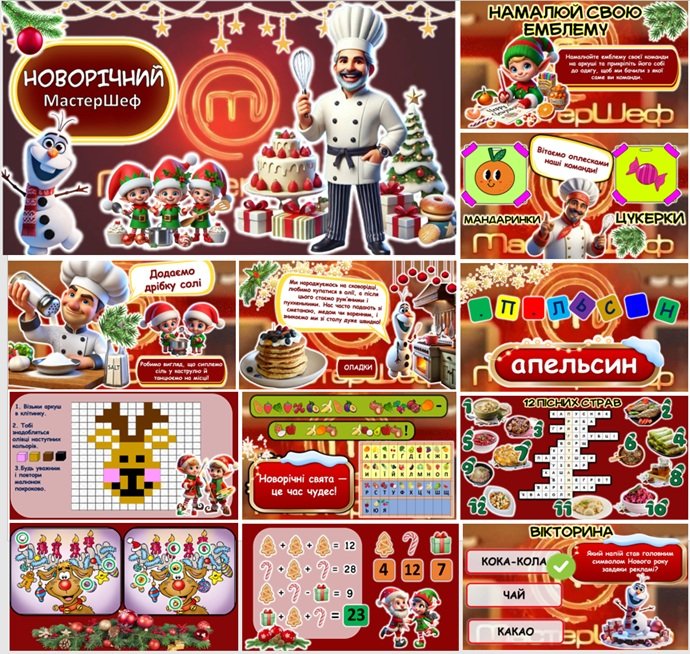 Організуйте незабутнє новорічне свято з інтерактивною грою «Новорічний МастерШеф 2025»! Презентація містить веселі конкурси для учнів, зокрема кулінарні вікторини, загадки про новорічні страви, майстерність у вимові скоромовок, малювання пряників, знайди відмінності, розв’яжи кулінарно-математичні завдання, логічні завдання та багато іншого. Усі конкурси підходять для онлайн та офлайн форматів. Переможці отримають справжній ковпак МастерШефа! Ідеально для новорічних свят і класних годин.
