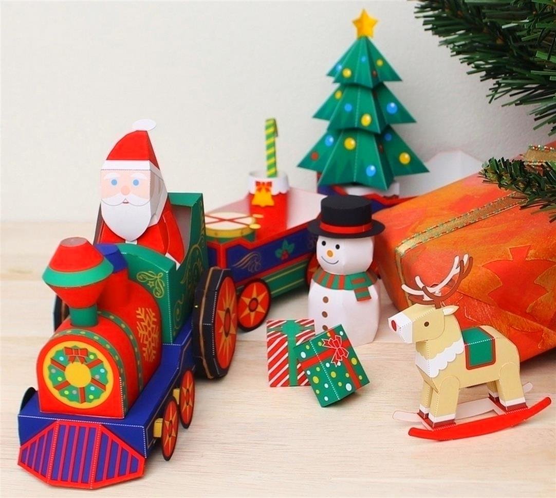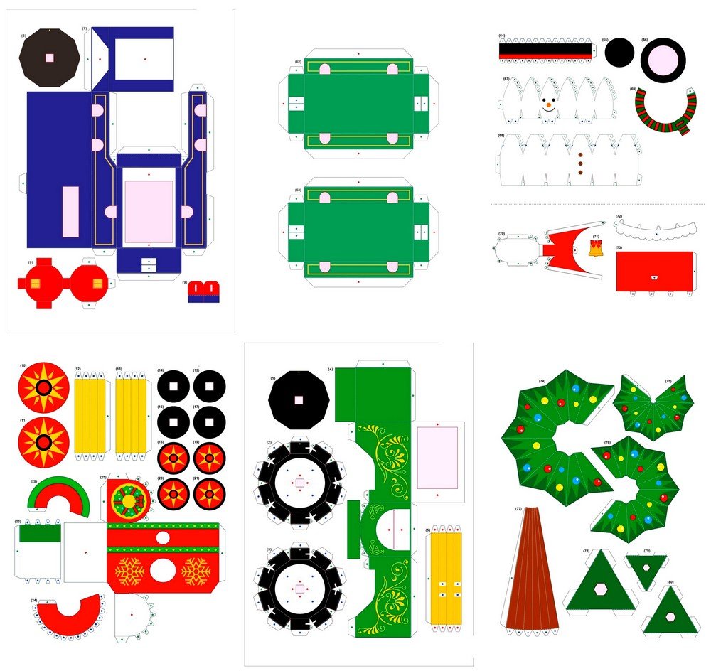 !!! НОВИЙ РІК. НОВОРІЧНИЙ ЕКСПРЕС.ОБ’ЄМНІ САНТА, ЯЛИНКА, СНІГОВИК, ОЛЕНЬ, ПОЇЗД (деталі на 11 арк. А4 шаблон об’ємної паперової поробки аплікації)