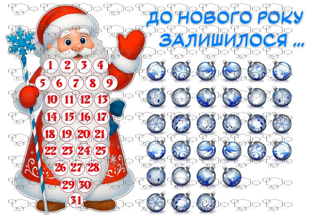 Дід Мороз із великою пишною бородою, на якій розміщені числа від 1 до 31. Щодня дошкільнята (учні) закривають одне число яскравою кулькою, аж поки всі цифри не сховаються — і ось уже Новий рік прийшов!