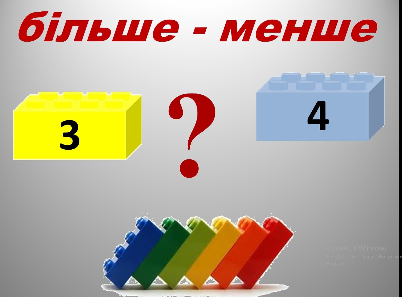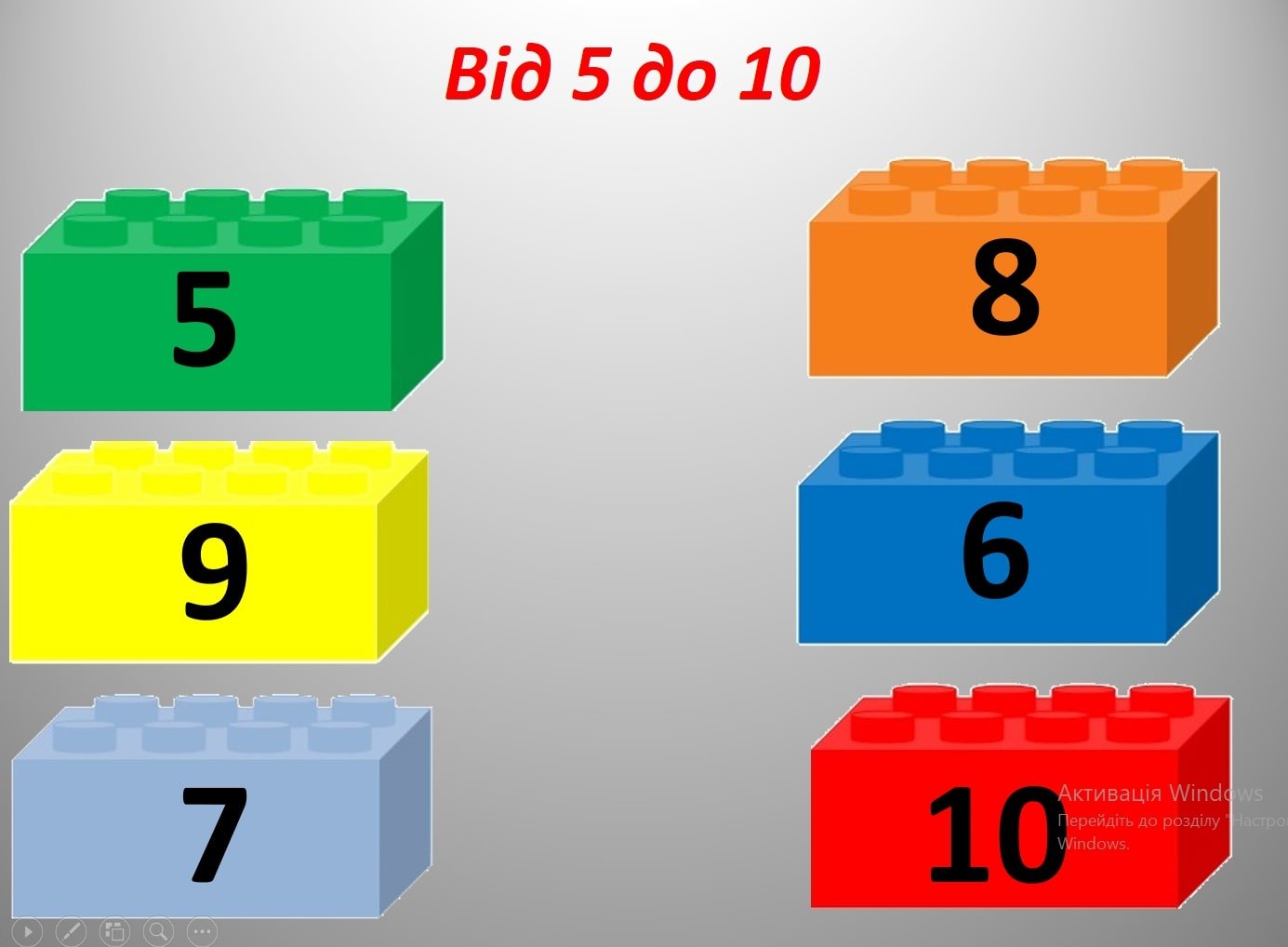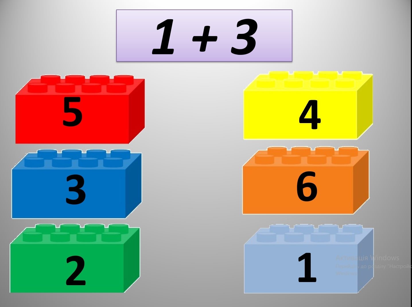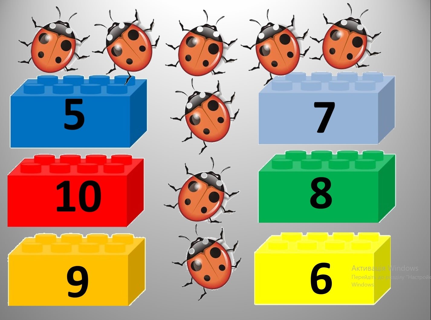 Інтерактивні вправи на відповідність кількості числу, вирази на додавання і віднімання в межах 10, порівняння чисел в межах 10 з цеглинками LEGO