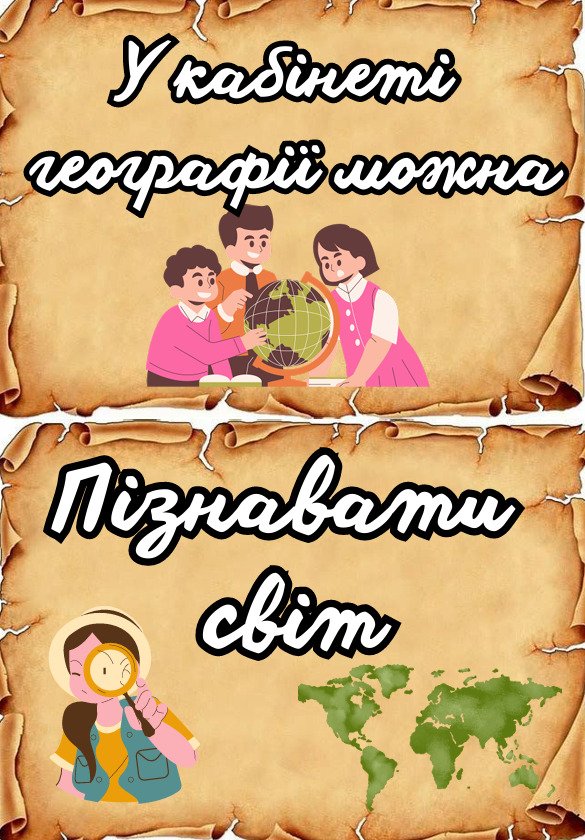 Таке оформлення створює навчальне середовище, де учням комфортно бути активними, сміливими у думках і дослідженнях. Воно підкреслює, що кабінет географії — це простір свободи, цікавості й поваги до знань, а також сприяє формуванню дослідницьких умінь і позитивного ставлення до предмета.