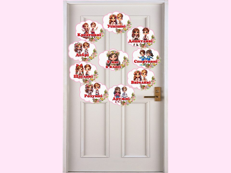 Яскравий набір для оформлення дверей до класу за концепцією НУШ. Матеріал у форматі pdf та png для зручності друку. Цікаве оформлення дверей одразу вирізнятиме ваш клас серед інших. Обов’язково сподобається і учням і батькам.