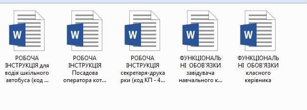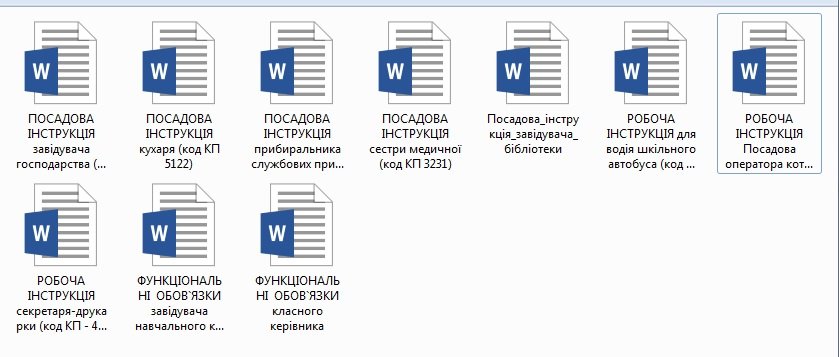 ‼ ПОСАДОВІ ІНСТРУКЦІЇ ПОСАДОВА ІНСТРУКЦІЯ сестри медичної (код КП 3231) ПОСАДОВА ІНСТРУКЦІЯ завідувача бібліотеки (код КП 1229.6) ПОСАДОВА ІНСТРУКЦІЯ завідувача господарства (код КП 1239) ПОСАДОВА ІНСТРУКЦІЯ кухаря (код КП 5122) ПОСАДОВА ІНСТРУКЦІЯ прибиральника службових приміщень (код КП 9132) РОБОЧА ІНСТРУКЦІЯ Посадова інструкція оператора котельні сезонного (КП 8162) РОБОЧА ІНСТРУКЦІЯ секретаря-друкарки (код КП – 4115) РОБОЧА ІНСТРУКЦІЯ для водія шкільного автобуса (код КП – 8322) ФУНКЦІОНАЛЬНІ ОБОВ`ЯЗКИ завідувача навчального кабінету ФУНКЦІОНАЛЬНІ ОБОВ`ЯЗКИ класного керівника