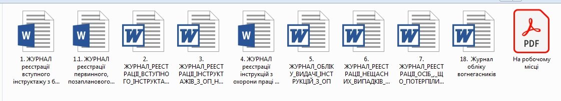 ‼ ЖУРНАЛИ 1. ЖУРНАЛ РЕЄСТРАЦІЯ вступного інструктажу з безпеки життєдіяльності здобувачів освіти в журналі обліку навчальних занять 1.1. Журнал реєстрації первинного, позапланового, цільового інструктажів здобувачів освіти з безпеки життєдіяльності 2. ЖУРНАЛ реєстрації вступного інструктажу з питань охорони праці для працівників 3. ЖУРНАЛ РЕEСТРАЦII IНСТРУКТАЖIВ З ОП НА РОБОЧОМУ МIСЦI 4. ЖУРНАЛ РЕЄСТРАЦІЇ ІНСТРУКЦІЙ З ОХОРОНИ ПРАЦІ В ЗАКЛАДІ ОСВІТИ 5. ЖУРНАЛ Обліку видачі інструкцій з охорони праці 6. ЖУРНАЛ реєстрації нещасних випадків невиробничого характеру 7. ЖУРНАЛ реєстрації осіб, що потерпіли від нещасних випадків 8. ЖУРНАЛ ОБЛІКУ ВОГНЕГАСНИКІВ