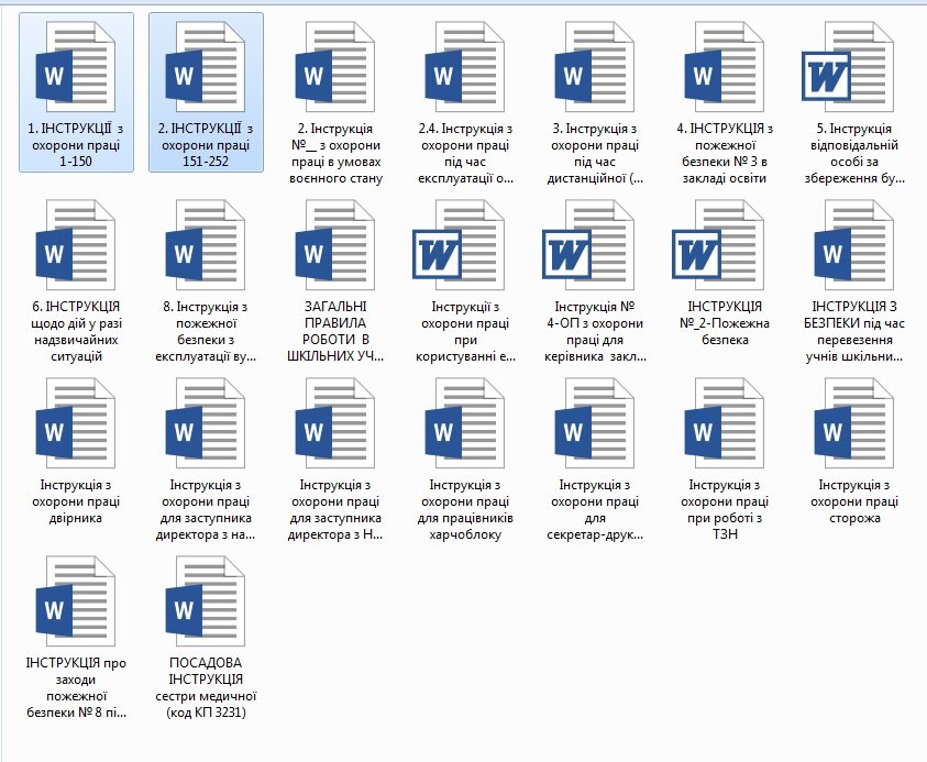 ‼ ІНСТРУКЦІЇ З ОП 1. ІНСТРУКЦІЯ щодо дій у разі надзвичайних ситуацій у закладі освіти 2. Інструкція №__ з охорони праці в умовах воєнного стану 3. Інструкція з охорони праці під час дистанційної (надомної) роботи в умовах воєнного стану 4. ІНСТРУКЦІЯ з пожежної безпеки 3 в закладі освіти 5. ІНСТРУКЦІЯ З БЕЗПЕКИ під час перевезення учнів шкільним автобусом 6. ІНСТРУКЦІЯ про заходи пожежної безпекипід час експлуатації пересувного генератора електроенергії 7. Інструкція з охорони праці під час експлуатації обладнання, яке працює під тиском 8. ІНСТРУКЦІЯ ПОЖЕЖНОЇ БЕЗПЕКИ З ЕКСПЛУАТАЦІЇ ВУГЛЕКИСЛОТНИХ ВОГНЕГАСНИКІВ 9. Інструкція відповідальній особі за збереження будівель та споруд закладу 10. Інструкція з охорони праці при використанні технічних засобів навчання (ТЗН) Інструкція з охорони праці для двірника Інструкція з охорони праці для сторожа Інструкція № 4-ОП з охорони праці для керівника закладу освіти Інструкція з охорони праці для директора школи Інструкція з охорони праці для заступника директора з НВР Інструкція з охорони праці для заступника директора з АГЧ Інструкція з охорони праці для педагога-організатора Інструкція з охорони праці для соціального педагога школи Інструкція з охорони праці чергового адміністратора школи Інструкція з охорони праці при роботі з персональним комп’ютером Інструкція з охорони праці при використанні мультимедійного проектора Інструкція з охорони праці про порядок дій персоналу при виявленні предмета, схожого на вибуховий пристрій Інструкція про дій при загрозі та виникненні надзвичайної ситуації терористичного характеру Інструкція з надання першої допомоги при нещасних випадках Інструкція з охорони праці для вчителя Інструкція з охорони праці для вчителів початкових класів Інструкція з охорони праці вчителя української мови та літератури Інструкція з охорони праці для вчителя іноземної мови Інструкція з охорони праці для вчителя математики Інструкція з охорони праці для вчителя інформатики Інструкція з охорони праці для вчителя фізики Інструкція з охорони праці для вчителя біології Інструкція з охорони праці для вчителя хімії Інструкція з охорони праці для вчителя історії та суспільствознавства Інструкція з охорони праці для вчителя географії Інструкція з охорони праці для вчителя музики Інструкція з охорони праці для вчителя технології Інструкція з охорони праці для вчителя образотворчого мистецтва Інструкція з охорони праці для вчителя основ здоров’я Інструкція з охорони праці для вчителя фізкультури Інструкція з охорони праці для вчителя предмета “Захист Вітчизни” Інструкція з охорони праці при роботі з персональним комп’ютером Інструкція з охорони праці для вихователя ГПД школи Інструкція з охорони праці для керівника гуртка (секції) Інструкція з охорони праці для вчителя на заміні Інструкція з охорони праці при використанні мультимедійного проектора Інструкція з охорони праці для завідувача навчальним кабінетом Інструкція з охорони праці в кабінеті географії Інструкція з охорони праці в навчальному кабінеті Інструкція з охорони праці при проведенні занять в кабінеті початкових класів Інструкція з охорони праці у групі подовженого дня Інструкція з охорони праці при проведенні навчально-польових зборів Інструкція з охорони праці для керівник