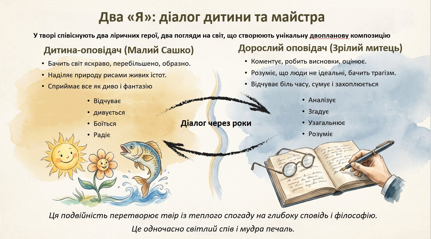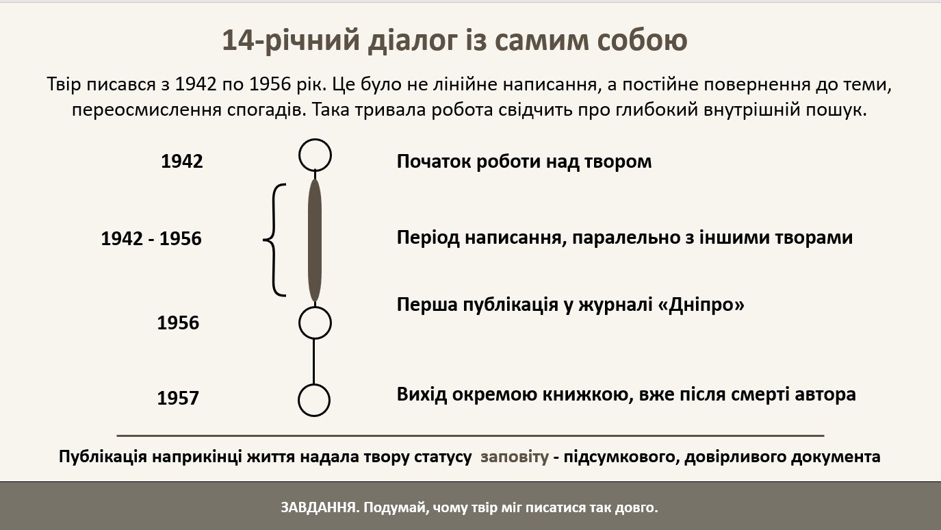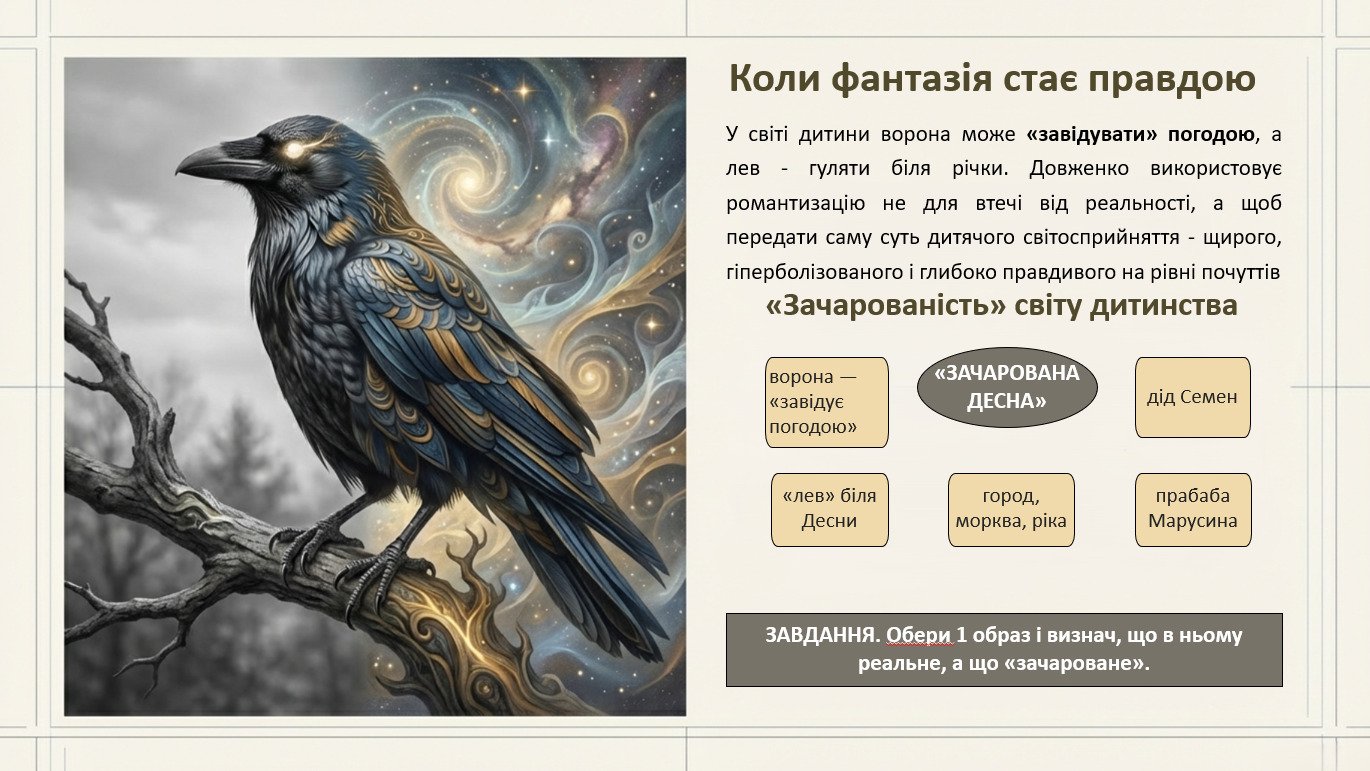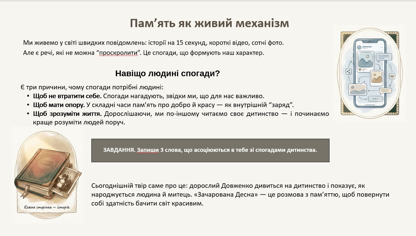 Готова презентація “Історія написання «Зачарованої Десни», автобіографічна основа, сповідальність” для уроку в 11 класі з логічною структурою, великими змістовними блоками, опорними схемами/таблицями та постійною взаємодією “вчитель–учень”. Паралельно учні заповнюють робочий аркуш «Паспорт твору», що допомагає систематизувати вивчене й утримувати увагу протягом уроку.