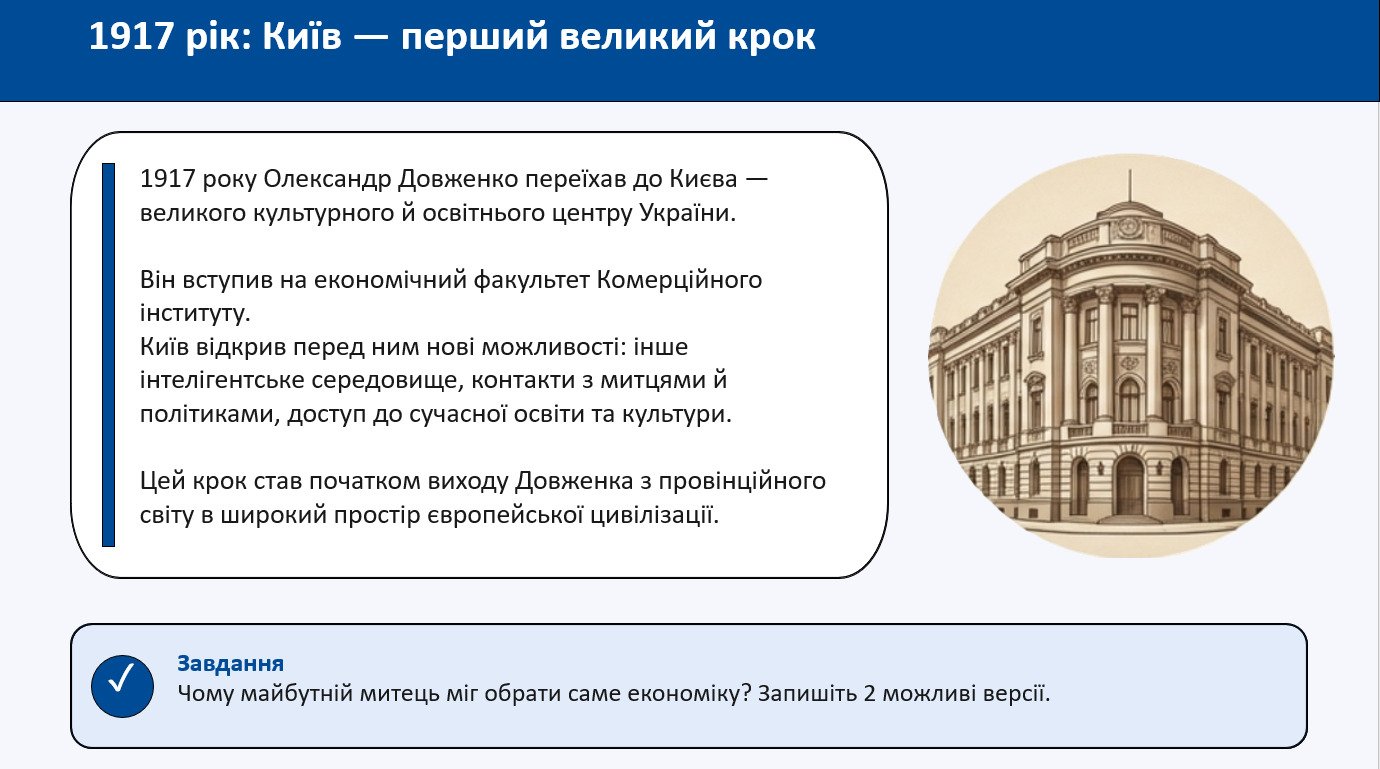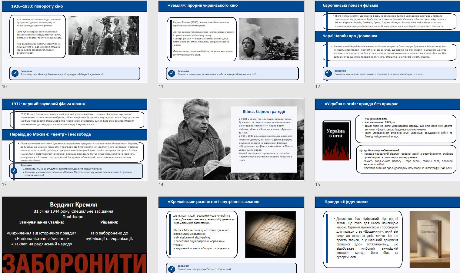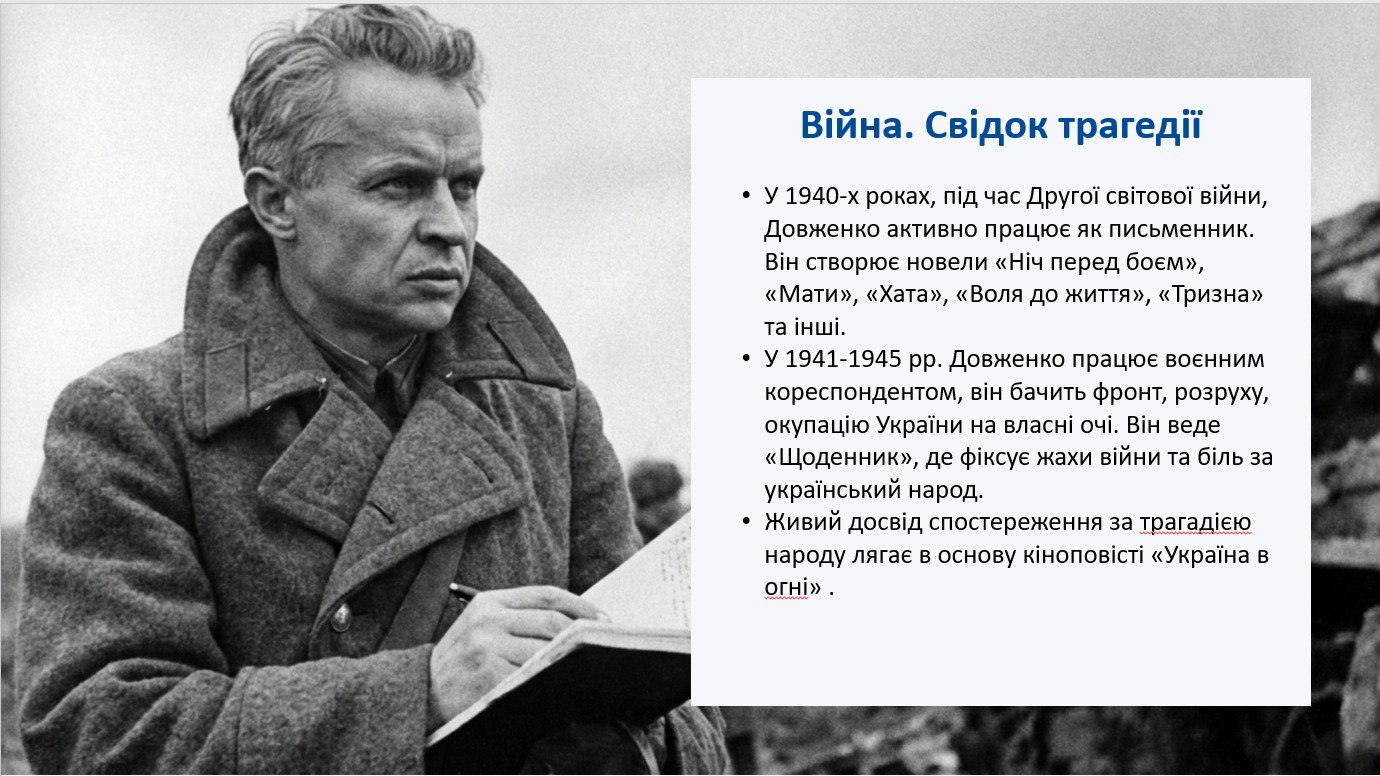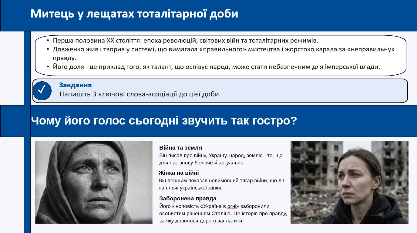 - Чітка логіка уроку: від контексту епохи → біографічної хронології → кінотворчості → воєнного періоду → «Україна в огні» → підсумків і рефлексії.