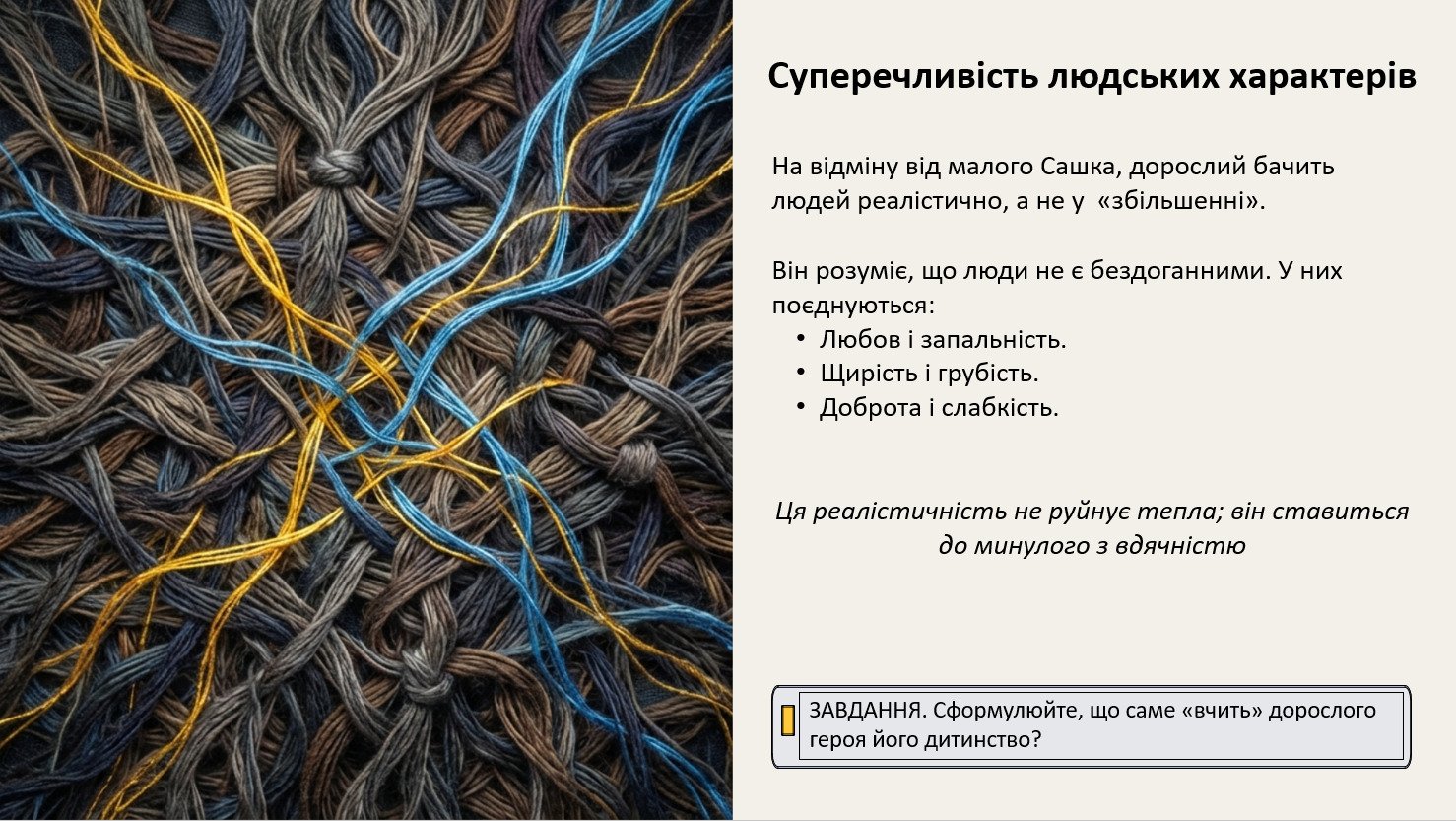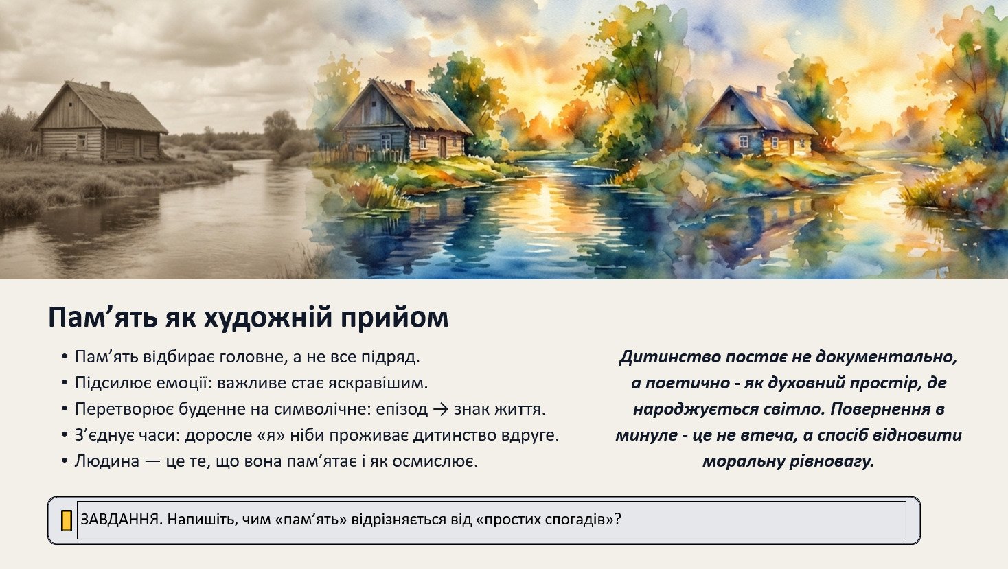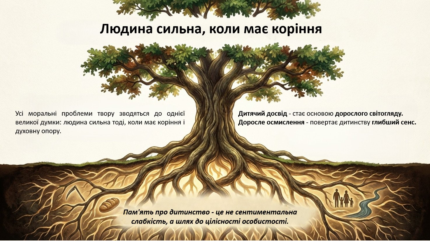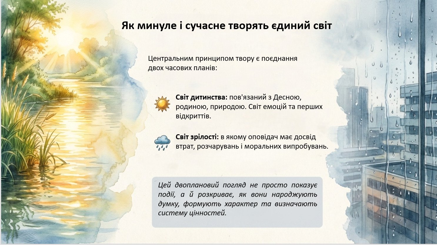 Взаємодія “минуле ↔ сучасне”: як дитинство формує духовний фундамент, а дорослість випробовує його; пам’ять як “міст”, що допомагає не зламатися.