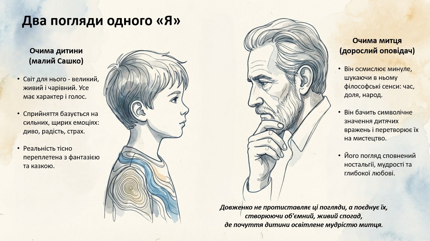 Два ліричні герої (малий Сашко / дорослий Сашко): різні оптики сприйняття світу (емоція й диво — проти мудрості, досвіду втрат, морального оцінювання).